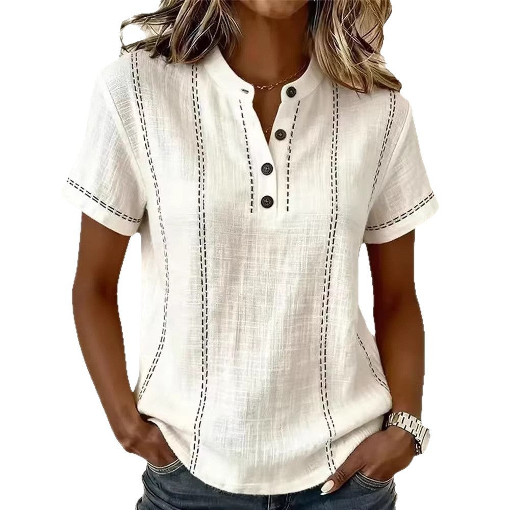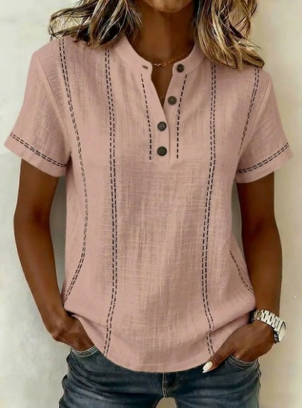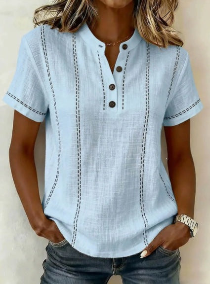 Casual Short-Sleeve Stand-Collar Solid-Color Patchwork Womens Shirt