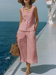 Classic Cotton-linen Square-neck Top And Capri Pants Set